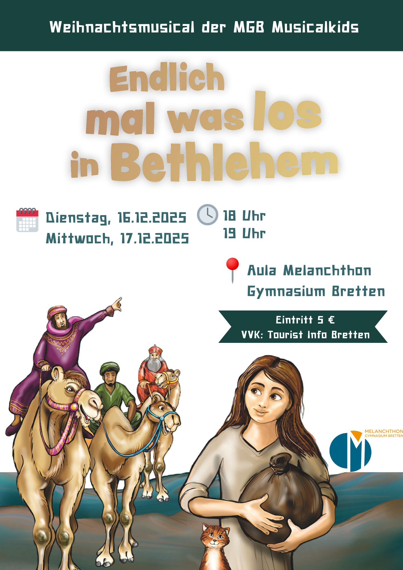 Die Musicalkids laden zum Weihnachtsmusical “Endlich mal was los in Bethlehem” ein. Die Aufführungen sind am Dienstag, 16.12. um 18 Uhr und am Mitt...